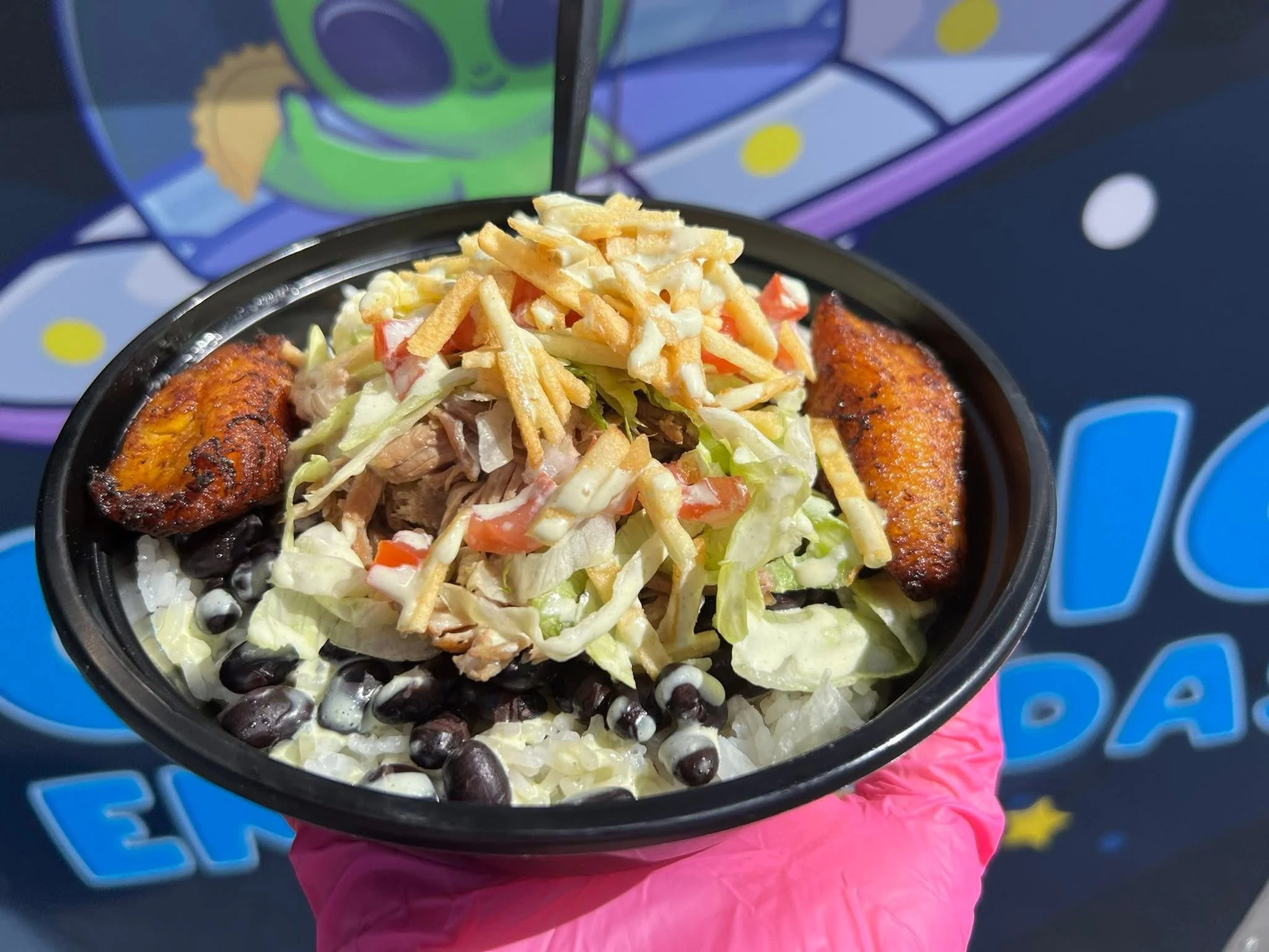 A cosmic bowl of rice and beans topped with tender slow-roasted pork, galaxy-fresh pico, crispy potato sticks, and cilantro drizzle, served alongside sweet plantains.