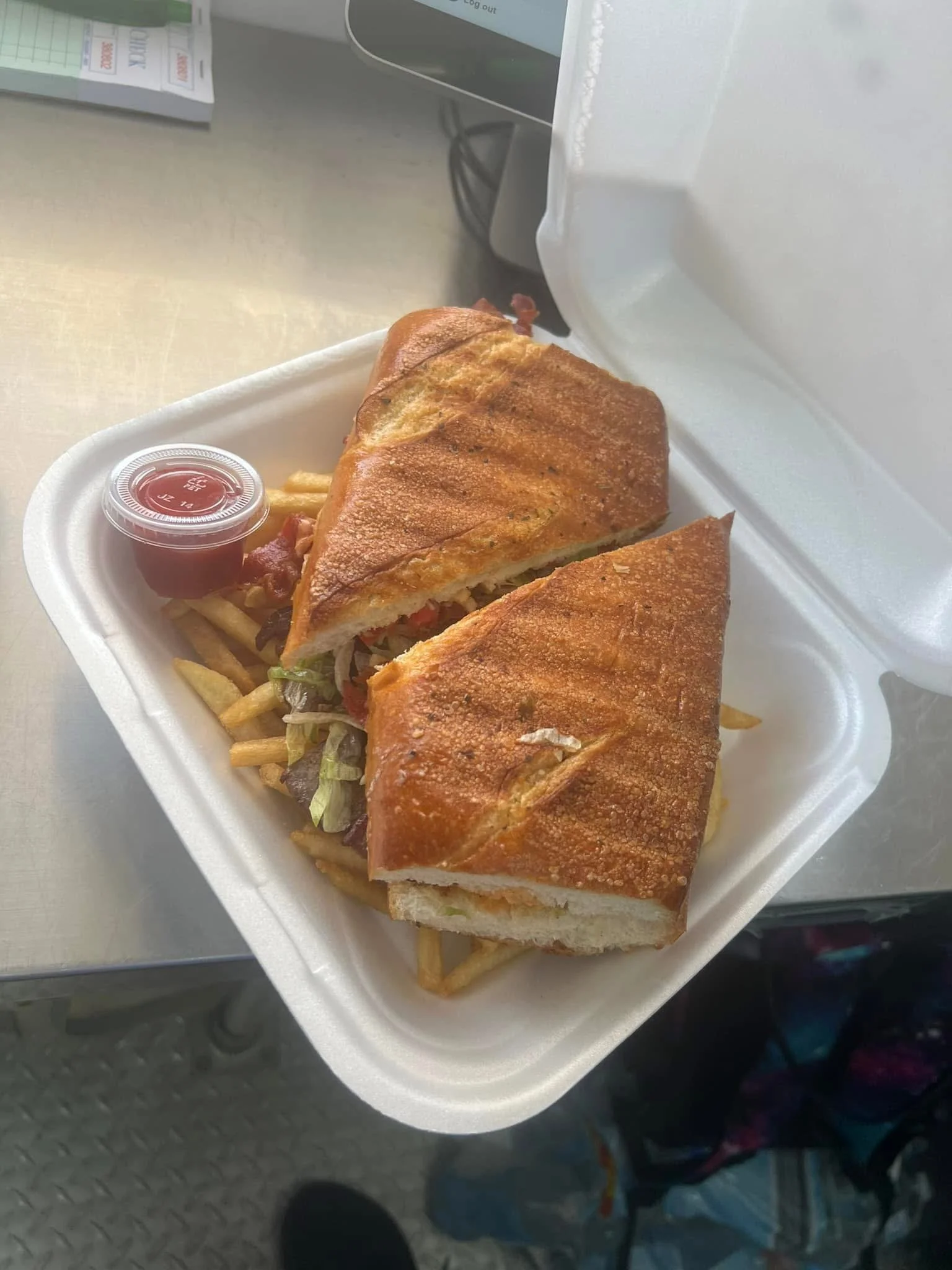 Garlic-seasoned steak layered with lettuce, tomato, potato sticks, and a swirl of mayo and ketchup — a stellar flavor stack in every bite